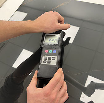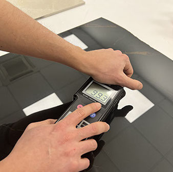 La unidad de medida de Gloss (Gloss Units o GU) es de 0 a 100 y define si la superficie final de un material es mate o brillante. Esta medición es útil para evaluar el brillo de la baldosa terminada o en construcción. De esta manera siempre se puede saber el resultado que se desea o no se quiere (que corregir) obtener con un determinado proceso productivo.